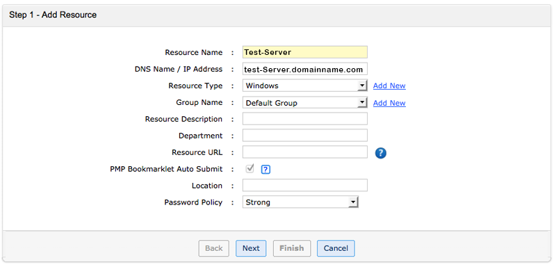 リソースを追加するには、次の3つのステップを行います。最初のステップでは、リソースに関する情報(名前、ホスト名、場所など)を設定します。次のステップでは、そのリソース上のアカウントの情報を設定します。最後のステップでは、PMPからリモートで、リソース上のパスワードをリセットするための設定を行います。