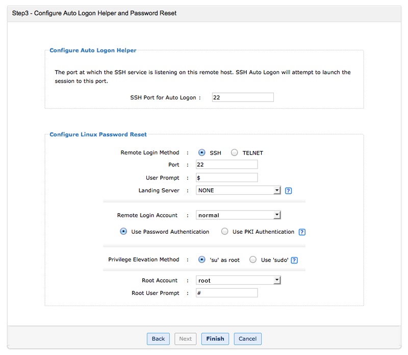 自動ログオンの設定 PMPはWebインタフェースからSSHを経由したリソースへの安全な直接接続をサポートします。自動ログオンの設定はここで行います。SSH経由で接続する際、接続ポート番号が既定の22番以外の場合はポート番号を指定する必要があります。リモートパスワードリセットの設定 UNIXリソース上のリモート パスワード リセットを行う場合、PMPが対象システムにログインするためにリモート ログイン アカウントを使用します。次に、パスワード リセットを実行するために権限の昇格を行います。PMPはrootへの "su"、あるいは "sudo" を利用してリモート パスワード リセットのコマンドを実行することができます。(対象のシステムが"sudo"のパスワードリセットコマンド実行をサポートしている場合。) この処理には、次のステップが含まれます: