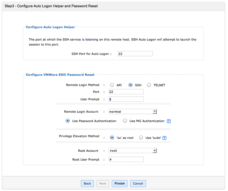 自動ログオンの設定 PMPはWebインタフェースからSSHを経由したリソースへの安全な直接接続をサポートします。自動ログオンの設定はここで行います。SSH経由で接続する際、接続ポート番号が既定の22番以外の場合はポート番号を指定する必要があります。 リモートでのパスワード リセットを設定 VMWare ESXiリソース上のリモート パスワード リセットを行う場合、PMPが対象システムにログインするためにリモート ログイン アカウントを使用します。次に、パスワード リセットを実行するために権限の昇格を行います。PMPはrootへの "su"、あるいは "sudo" を利用してリモート パスワード リセットのコマンドを実行することができます。(対象のシステムが"sudo"のパスワードリセットコマンド実行をサポートしている場合。) この処理には、次のステップが含まれます: