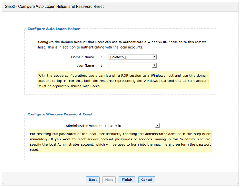 エージェントを使用しない場合、ステップ3の手順に従い、パスワード リセットを実行してください。リソースへログインし、パスワードを変更するために使用する資格情報を入力します。Windows domain controller, Linux, IBM AIX, HP UNIX, Solaris, Mac OS, VMWare ESXi, MS SQL Server, MySQL, Oracle DB, Sybase ASE, LDAP Server, HP ProCurve, HP iLO and Cisco (IOS, CatOS, PIX), Juniper Netscreen の場合、リモート パスワード リセットを行うためのアカウントを指定します。上記以外のリソース種別の場合、本手順は適用できません。