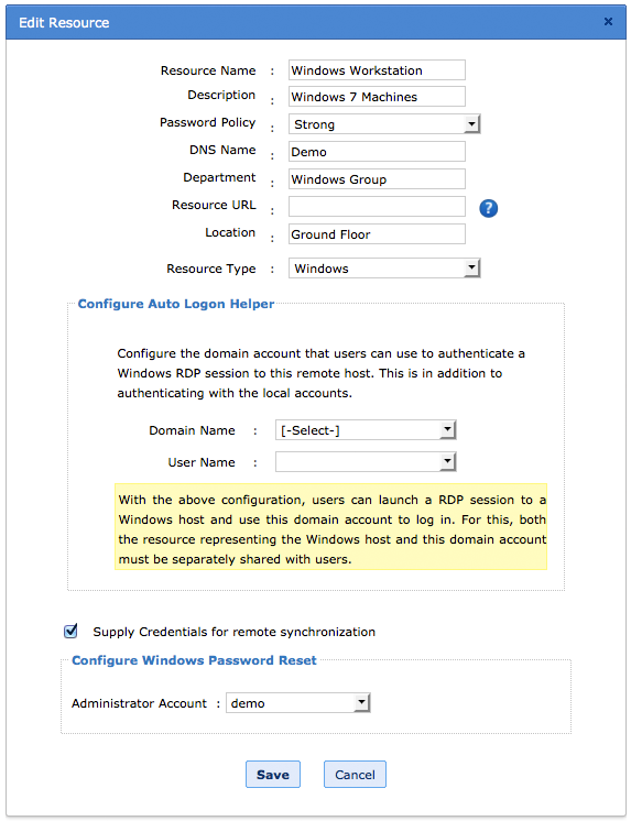 - Windowsドメイン リソース上の[編集]ボタンをクリックし、[リモート同期の資格情報]のセクションで入力したドメイン管理者アカウントを選択します。次のスクリーンショットを参照してください;