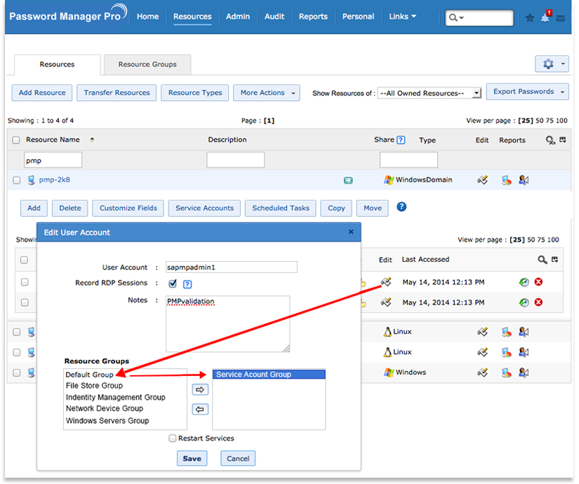 - サービス アカウントの[編集] をクリックし、作成したリソース グループを右側のボックスに移動して[保存]をクリックします。次のスクリーンショットを参照してください;