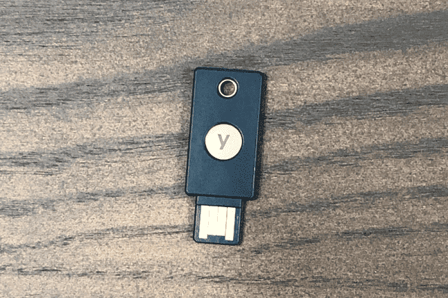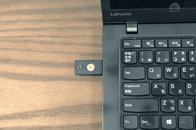 冒頭から何度も「物理セキュリティキー」と言っていますが、実物を見たことがない人は「物理?何のこと?」と思うかもしれません。一言で説明すると、「暗証番号」や「パスワード」のような情報としてのキーではなく、物理的なキーのことです。以下は、弊社で実際にPassword Manager Proとの連携を検証する際に使用したYubiKeyです。