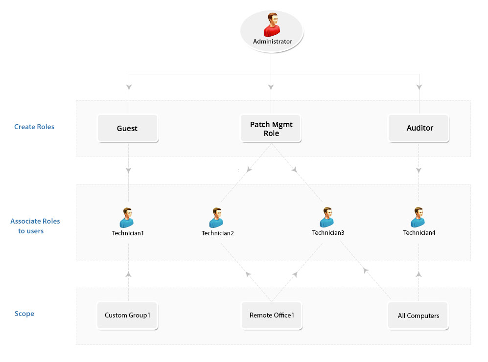 Patch Manager Plusには、ユーザーに範囲を定義する権限があります。つまり、ターゲットコンピュータを定義して、すべてのユーザーにマップすることができます。ユーザーのアクセス許可を特定のコンピュータのセットに制限することで、ユーザーがその役割を実行するのに十分なアクセス許可を持ち、過度に利用するのに十分なアクセス許可を持っていないことを確認できます。