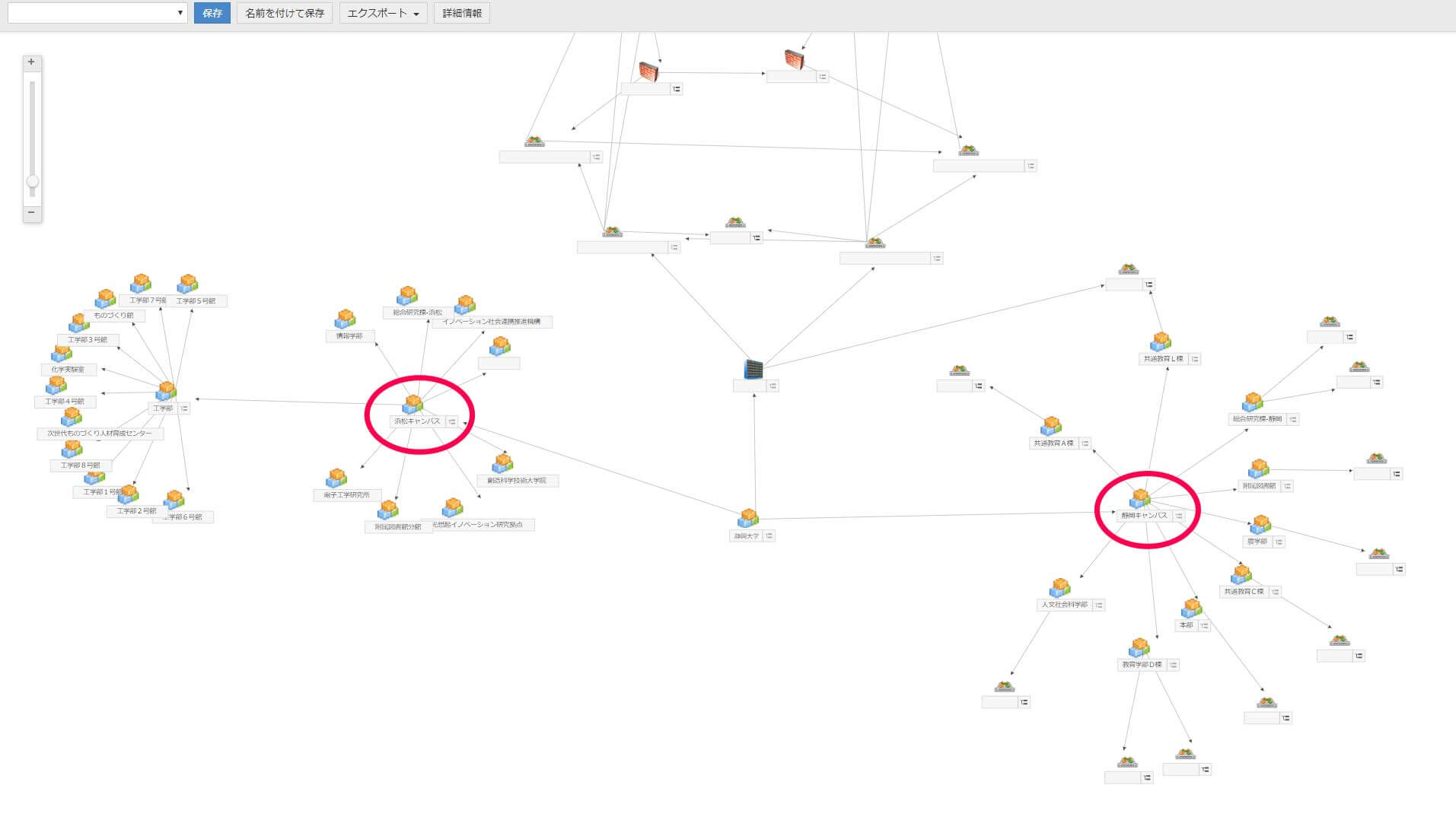 本来はCI(構成アイテム)にはカウントしないキャンパスや棟名まで登録して資産との紐付け が見えるようになった。どの棟に棟スイッチがあるか分かり、各棟を展開していくと包含するスイッチ群が階層構造で展開できる。アカウント設定の負荷軽減