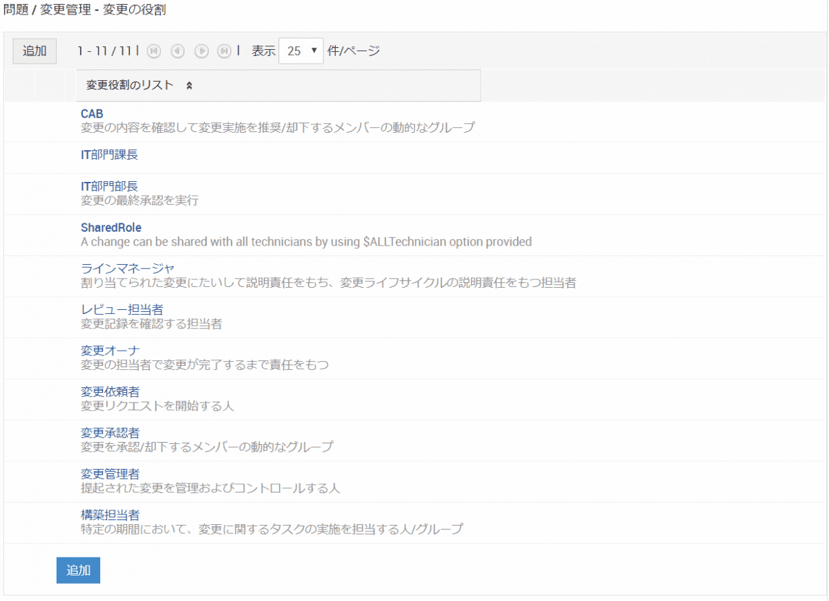 変更の関係者には変更管理プロセスをサポートするために適切な役割を割り当てる必要があります。ServiceDesk Plusの変更の役割は変更管理機能におけるアクセス権限です。あらかじめ定義されている変更の役割のほかに、必要に応じて組織固有の役割を追加できます。