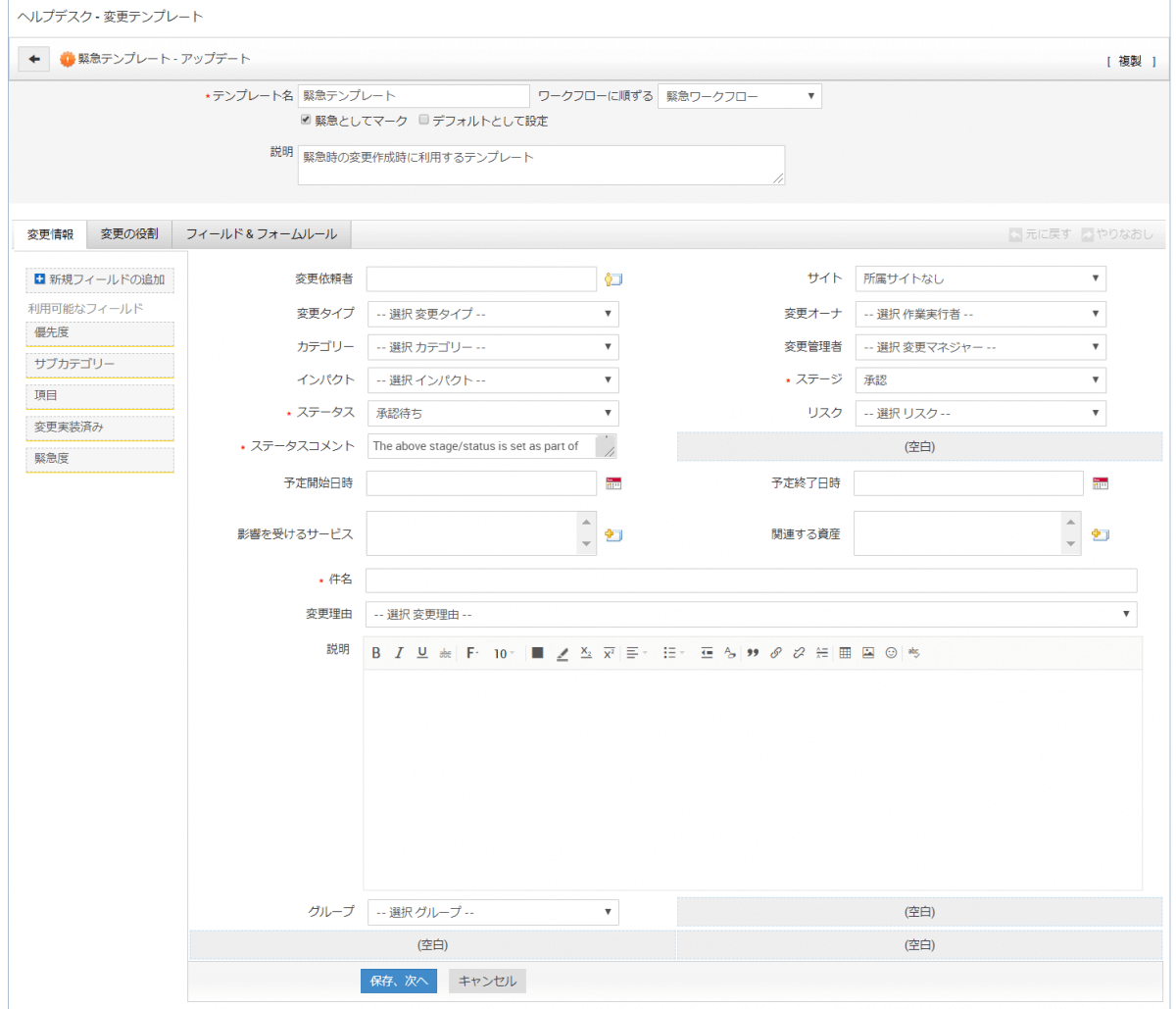 ServiceDesk Plusでは適切な変更管理プロセスを実施できるよう、変更タイプ・CAB・変更の役割・変更ステージ・変更テンプレート・変更ワークフローなどの変更管理機能を提供します。