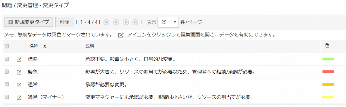 - 標準的な変更…事前に承認されている軽微な変更です。リスクが低い、頻繁に発生する、手順書が定義されている変更が標準的な変更として分類されます。