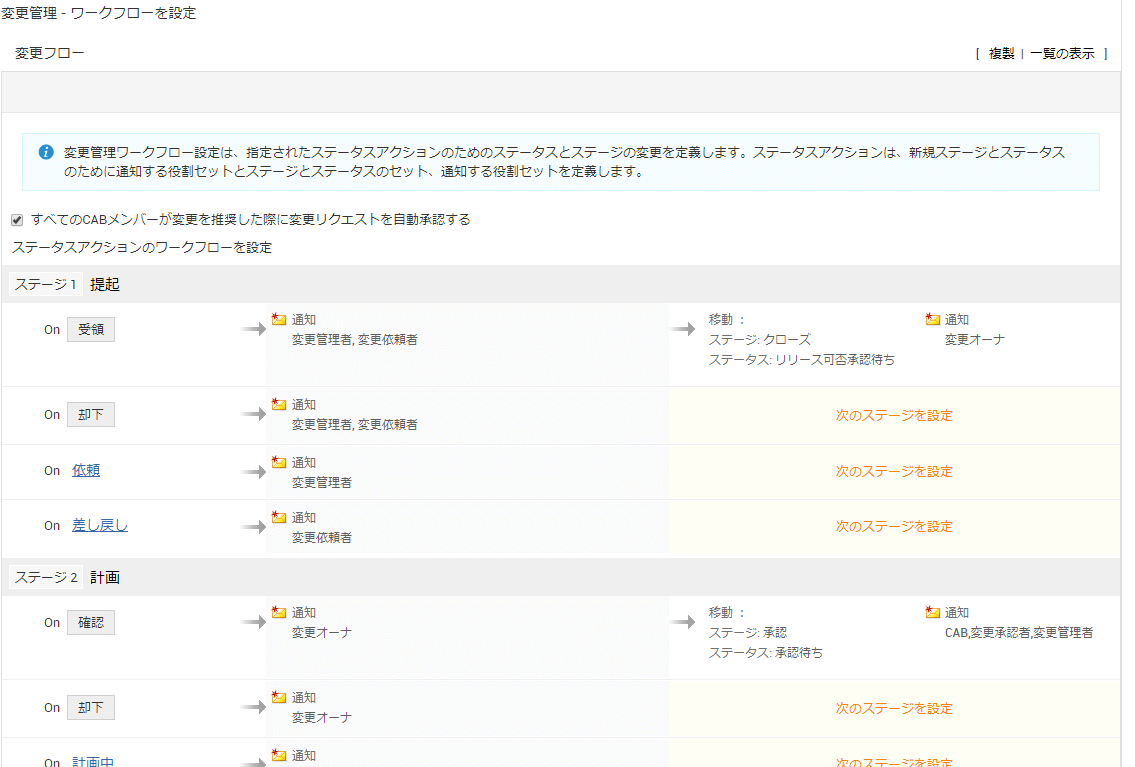 変更ライフサイクルの各段階を進行するにあたり、承認済み(Approved)、却下(Rejected)、情報の要求(Request for Information)などのステータスで進捗を把握します。関係者に変更のステータスを知らせる自動通知メール機能を備えています。自動通知メールのテンプレートは任意にカスタマイズできます。