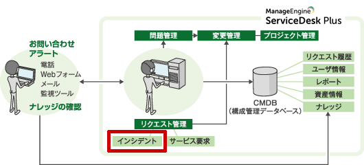 情報システム部門やサービスデスク部門では、インシデント管理をユーザーからのリクエスト管理システムだけでなく、監視システムなどとも連携して行っています。ユーザーからリクエストを受け付けると、担当者は利用システムの構成情報の確認や、エンジニアやベンダーへのエスカレーションによって、早急にサービスを復旧させようとします。インシデント管理ツールに蓄積されたデータをもとに、ITサービスの改善に役立てることも可能となります。