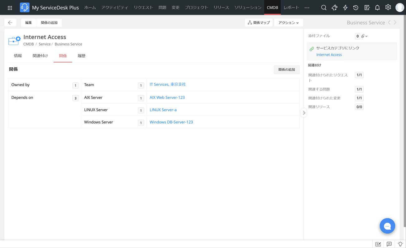 サービスの所有部門や依存関係にあるサーバー群(AIX/Linux/Windows)など、関連するCI情報を一覧で表示。CI同士を関係性で記録し、障害時の影響分析や変更管理の精度を高めます。