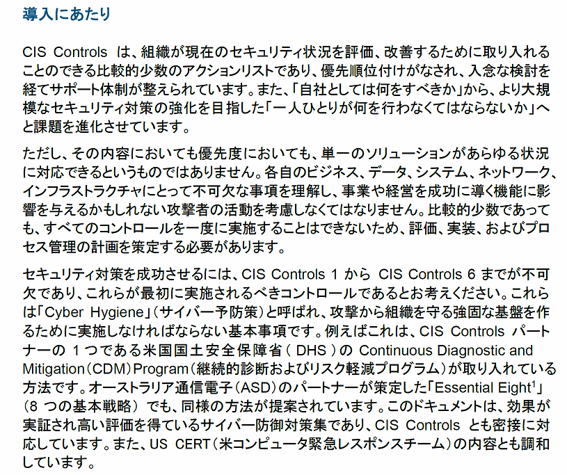 CIS Controlsには、このような多数の組織の専門家の持つ、サイバー攻撃に関する実践的な知識が蓄積されています。