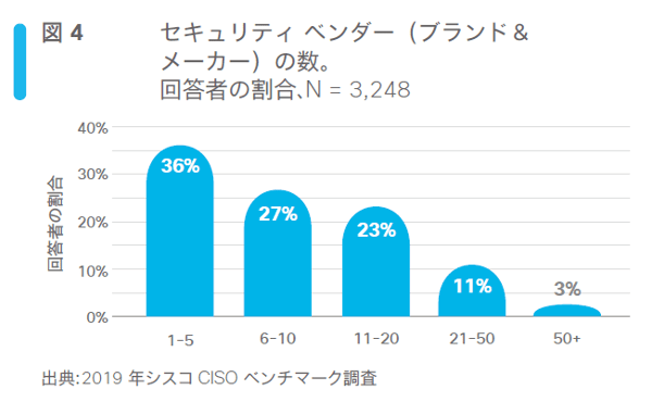 日本国内組織の27%が6-10社のセキュリティベンダーの製品を併用し、23%が11-20社の製品を併用していると「2019年版CISOベンチマーク調査」で明らかになっています。