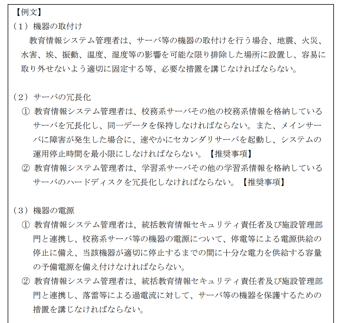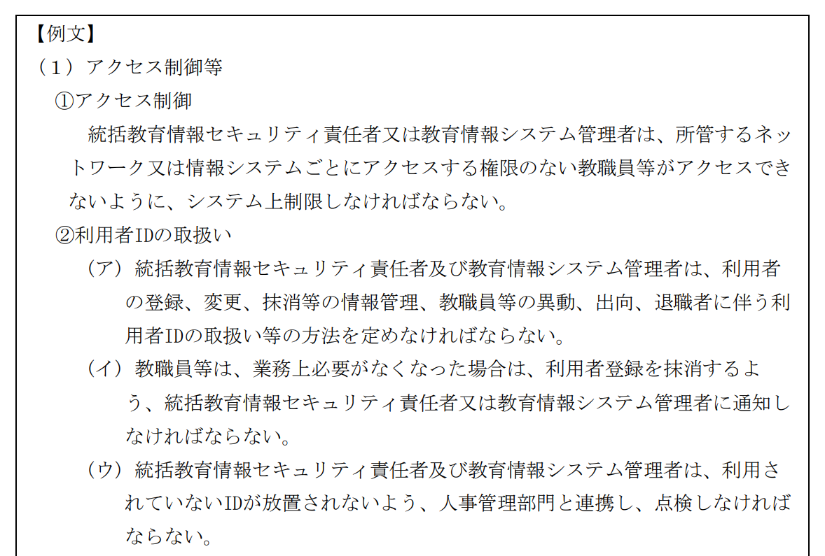 | 人的セキュリティ | 教職員等の遵守事項や、情報セキュリティに関する研修・訓練、情報セキュリティインシデントを認知した場合の報告義務、ID及びパスワード等の管理に関する遵守事項などに関する内容 |