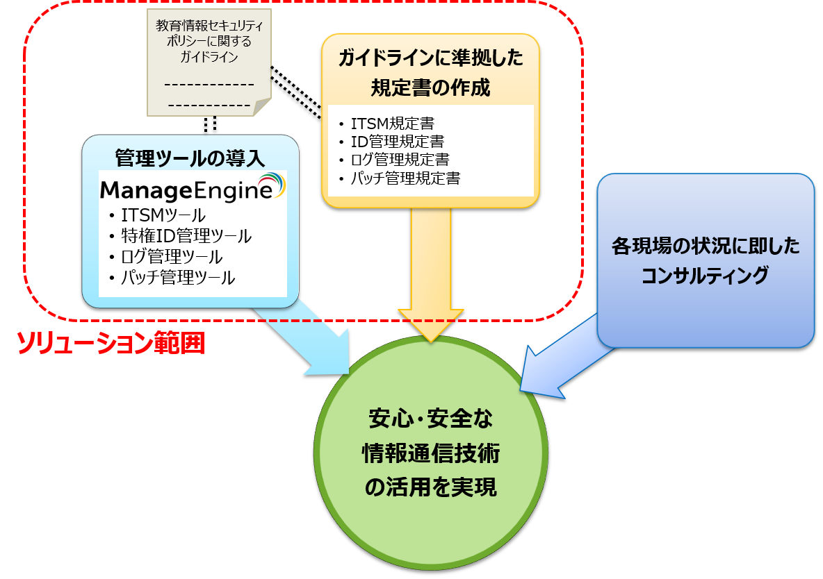 ManageEngineでは、教育情報セキュリティポリシーに関するガイドラインの適用をITサービスマネジメント(ITSM)の観点から支援するソリューションを提供しています。