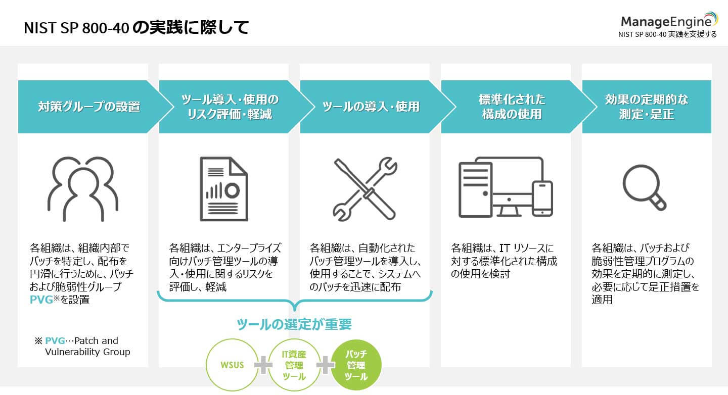 パッチおよび脆弱性グループは、NISTの推奨プロセスで重要なポジションと位置付けられており、NIST SP 800-40のすべての章で言及されています。