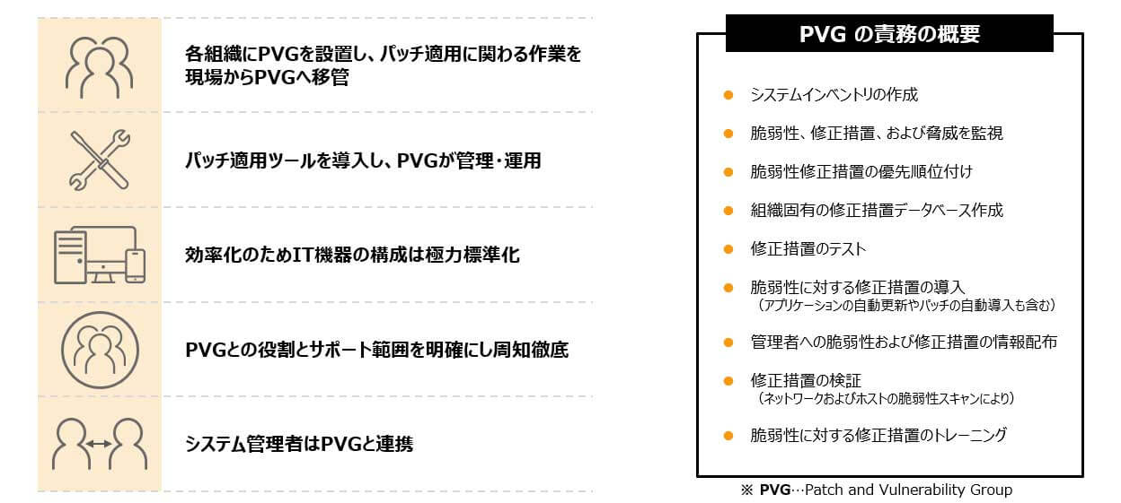 パッチおよび脆弱性グループ(PVG:Patch and Vulnerability Group)は、組織内部でパッチを特定し、配布を円滑に行うことを専門とした対策グループのことです。