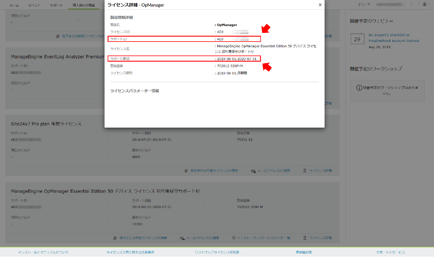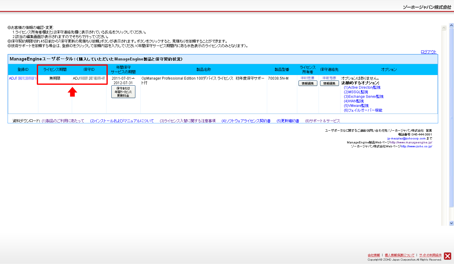 加入された保守サービスの期間、および保守ID は、ManageEngine Communityに、次のように記載されています。保守IDは、保守サービスユーザーが技術サポートを依頼されるとき、およびこの保守サービスの更新の申し込みをされるときに必要です。