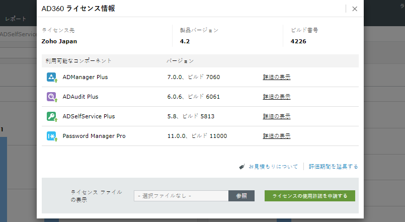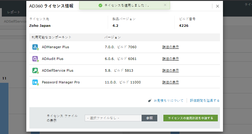 なお、ライセンスファイルの取得につきましては、弊社ライセンス担当(メール : jp-license@zohocorp.com)までご連絡ください。