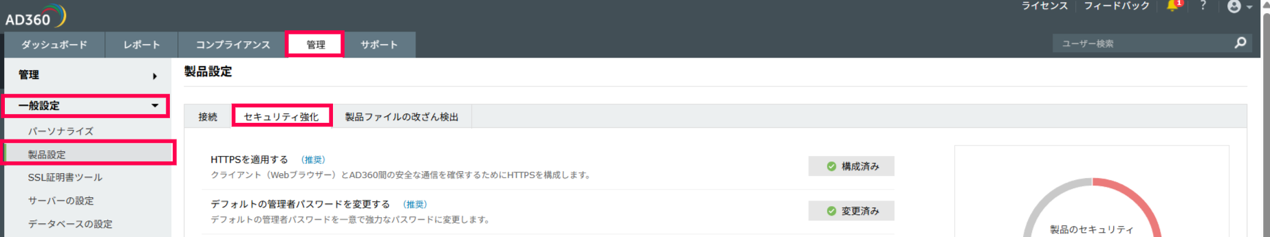 - [管理]タブ-->[一般設定]-->[製品設定]-->[セキュリティ強化]タブをクリックします。
