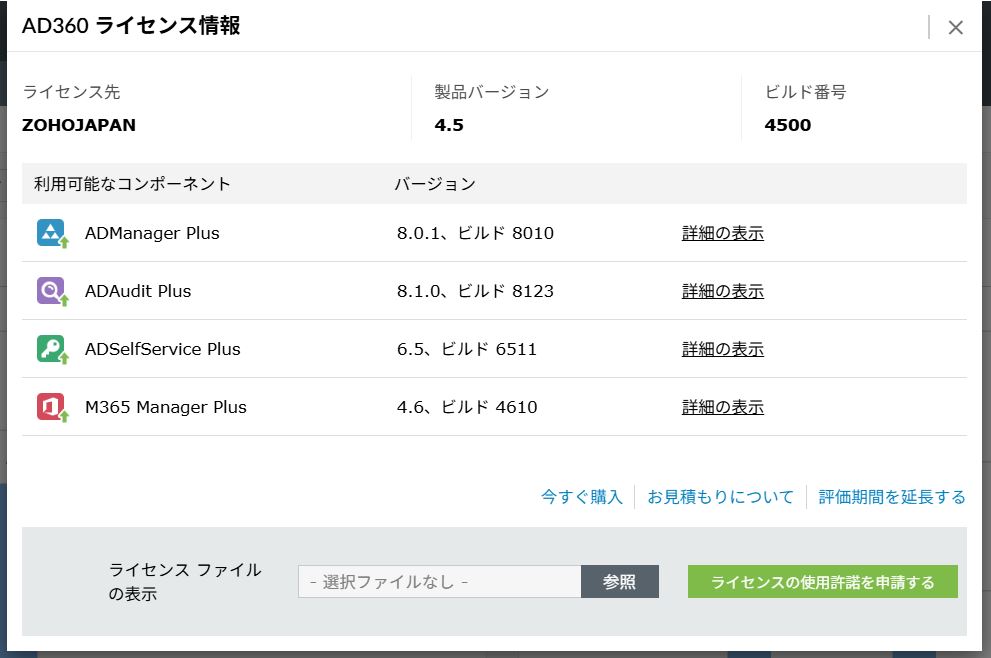 ビルド番号の確認方法 作成日:2022-01-19 | 更新日:2025-11-10 ライセンス 設定と操作 ご利用中の「AD360」のバージョン/ビルド番号を確認するには、次の手順をご参照ください。 管理者としてAD360にログインします。 画面右上の[ライセンス]をクリックします。 [ライセンス情報]画面上で、「製品バージョン」または「ビルド番号」を確認します。 バージョン:「ビルド」の文字の左側に表示されている数字です。 ビルド:「ビルド」の文字の右側に表示されている数字です。 連携しているコンポーネント製品のバージョン/ビルドもご確認いただけます。 このナレッジの総閲覧回数: 1,165 関連するナレッジはありません