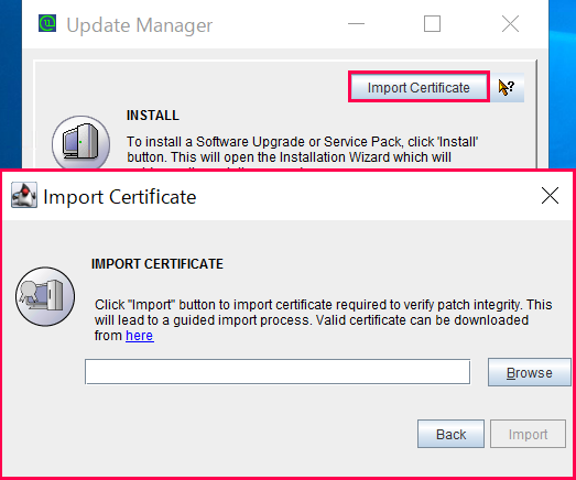 証明書のインポートに関するウィザードが表示された場合は、こちらより取得した証明書(.crt)をインポートしてください。 - “Service Pack installed successfully”と表示されるのを確認し[Close]をクリック