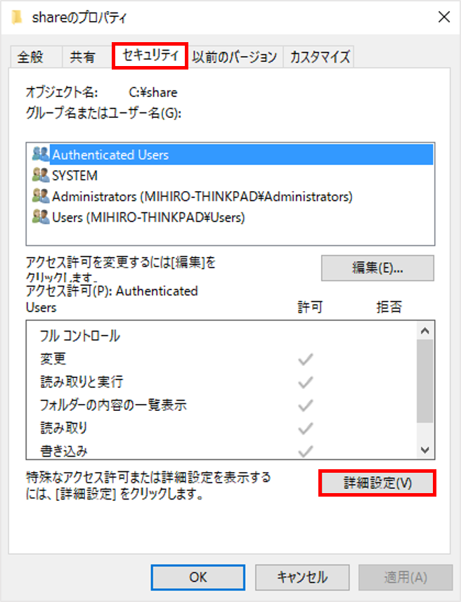 4.[セキュリティの詳細設定]画面が表示されるので、[監査]タブへ移動します。