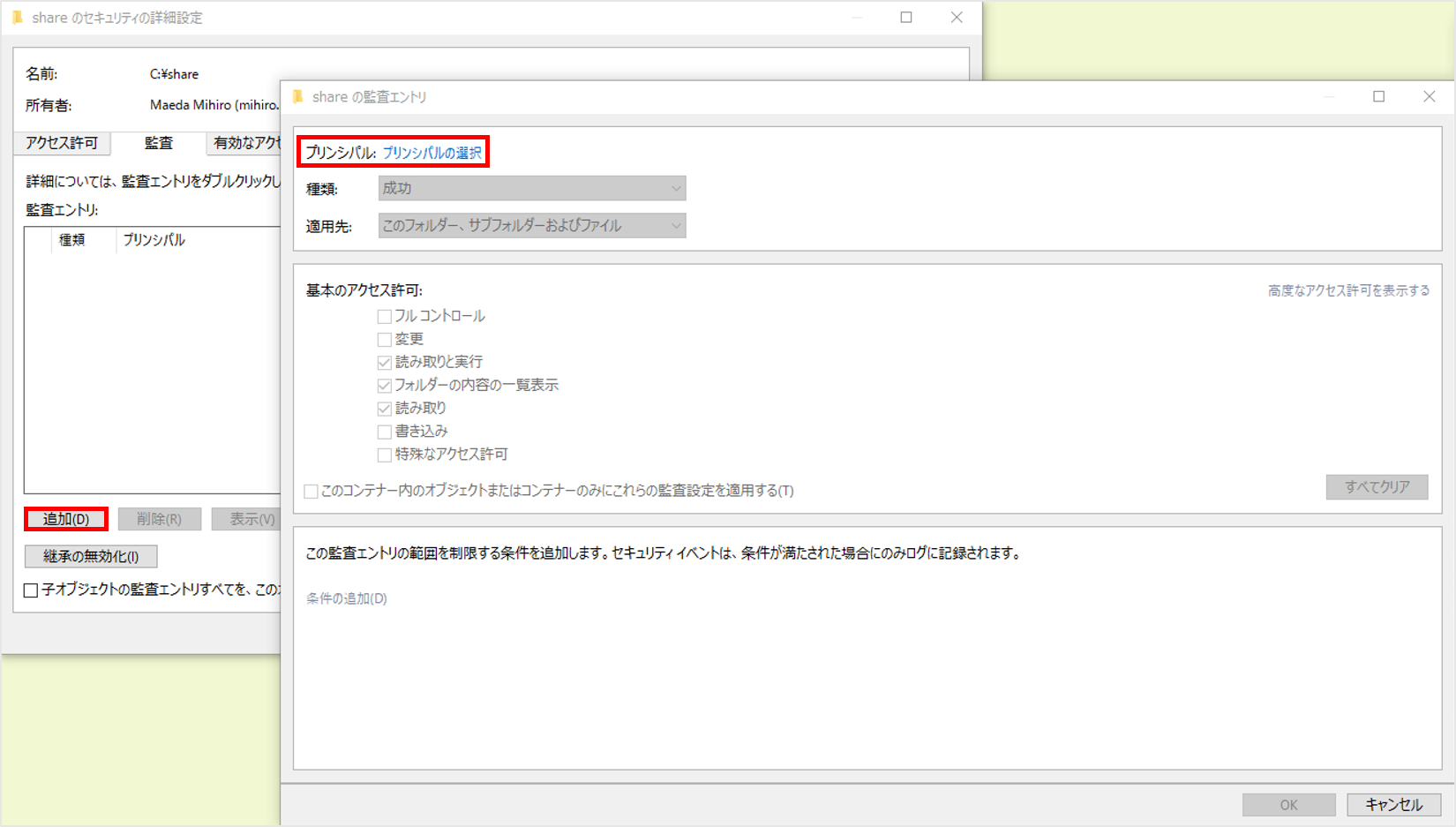 | 特別なアクセス許可用のSACL | 監査対象となる共有フォルダ | Everyone | すべて |