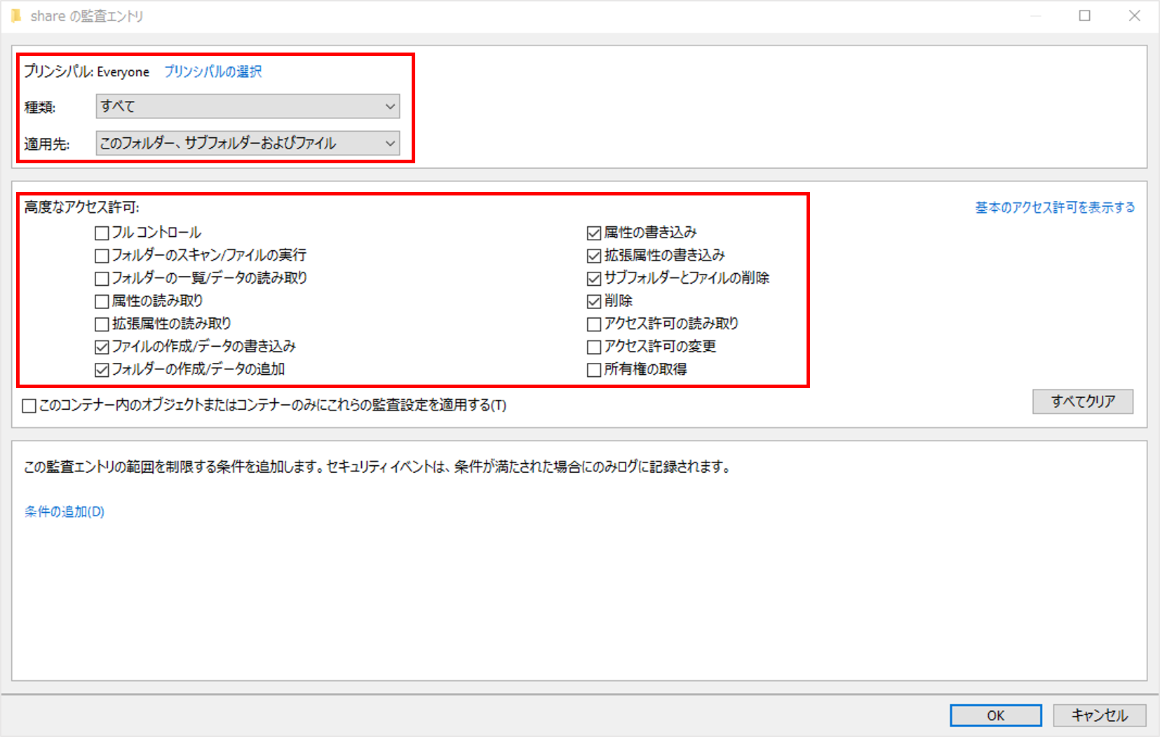 | 変更アクセス許可用のSACL | 監査対象となる共有フォルダ | Everyone | すべて |