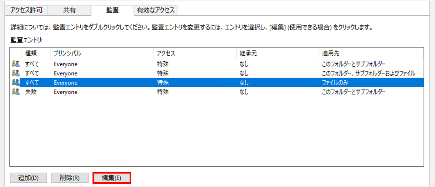 5.適用先が「ファイルのみ」となっている監査エントリを選択して、「編集」をクリックします。