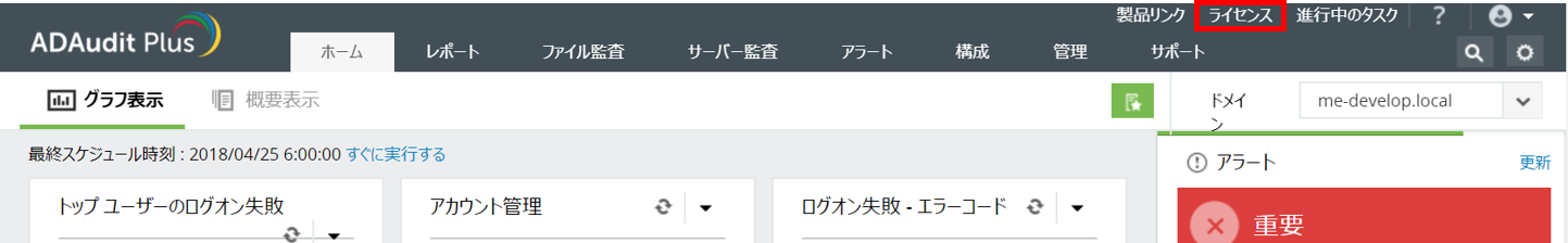 1) 管理者権限のユーザー(デフォルトではadmin)でログイン後、[ライセンス]をクリックします。