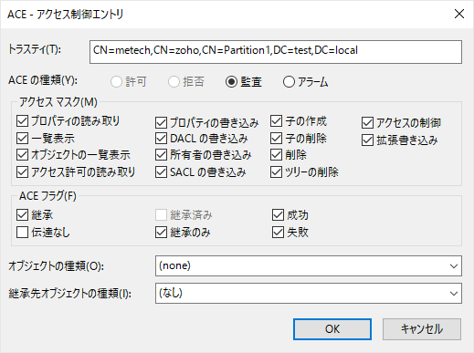 8.[トラスティ]に監査対象のグループを指定後、監査する操作と属性、継承の有無、監査するログタイプ(成功・失敗)を選択して、[OK]をクリックします。