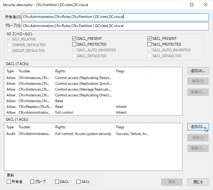 7.[Security descriptor]の画面が開くと、SACLボックスの右にある[追加]をクリックします。