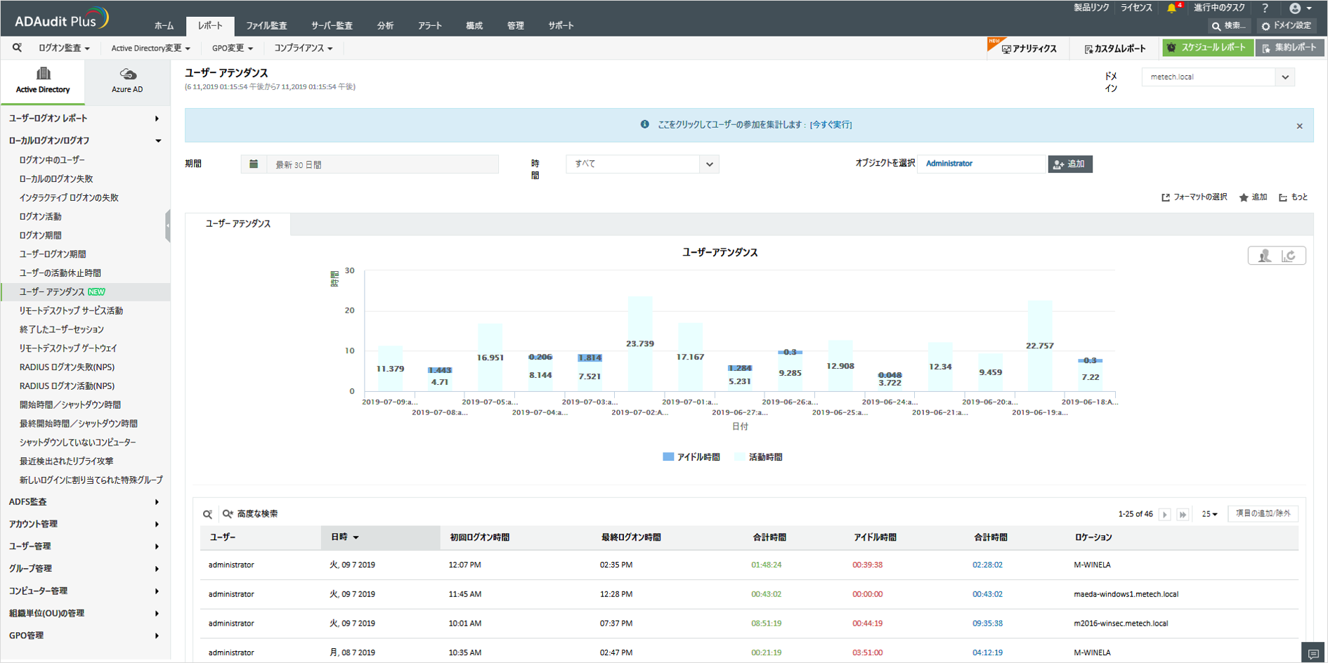 メンバーサーバー、ワークステーションを対象としたユーザーアテンダンスレポートを生成したい場合、メンバーサーバー、ワークステーションのオプションライセンスをご購入いただく必要がございます(オプションの詳細はこちらを参照)。