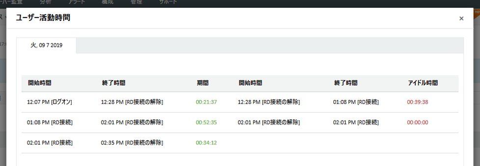 ユーザーを日ごとに、PC上でのアクティブ/非アクティブな活動時間を集計したレポートです。ユーザーアテンダンスレポートを利用することにより、勤怠管理の突き合わせや打刻時刻に対してPCの起動・停止時間が大幅にずれていないかを確認できます。