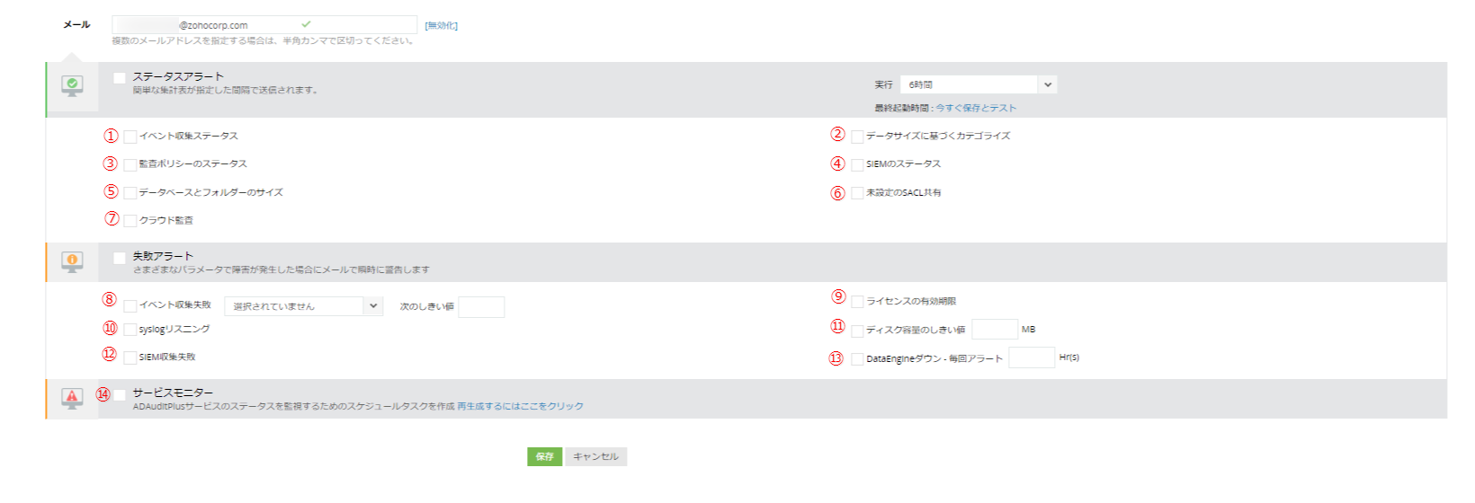 メールアドレス記入ボックス内に通知先となるメールアドレスを入力することで、各項目を有効化できます。