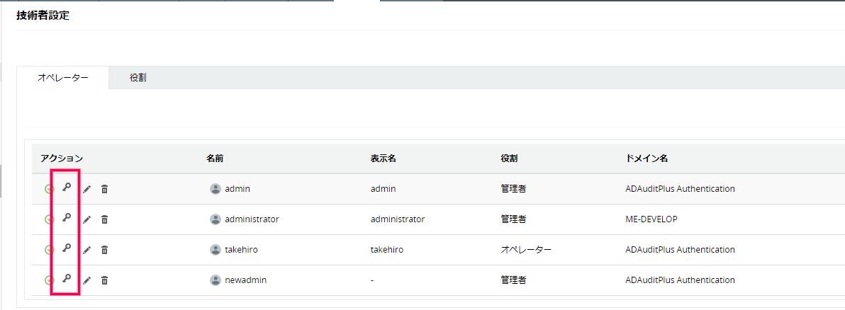 3. パスワードをリセットしたい技術者に対するリセットボタン(以下画像の赤枠)をクリックします。