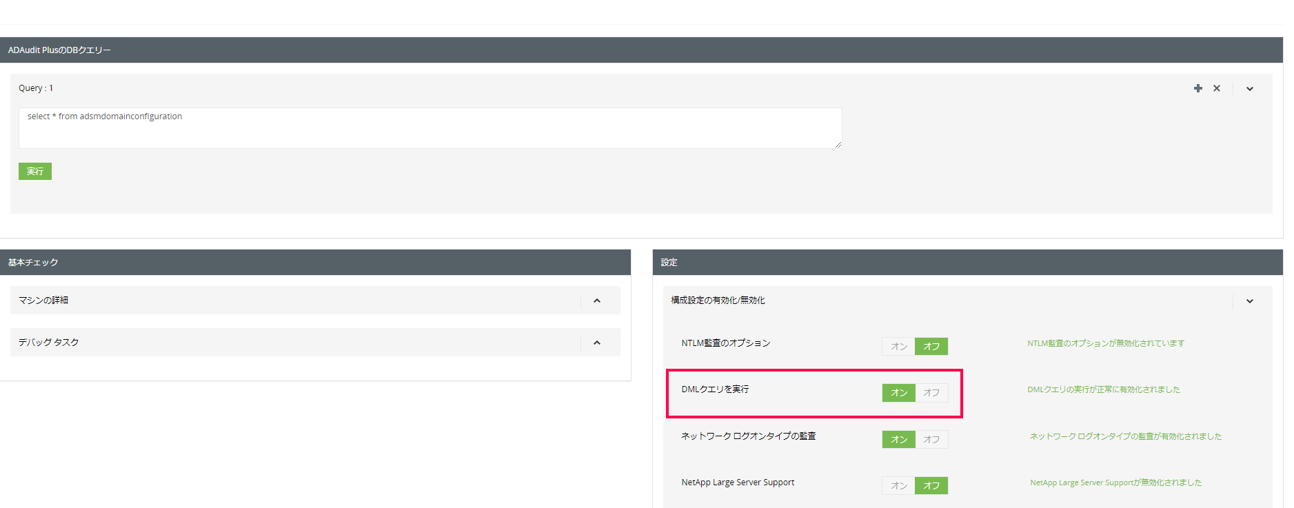 - [設定] → [構成設定の有効化/無効化]を展開し、[DMLクエリを実行]を「オン」に設定