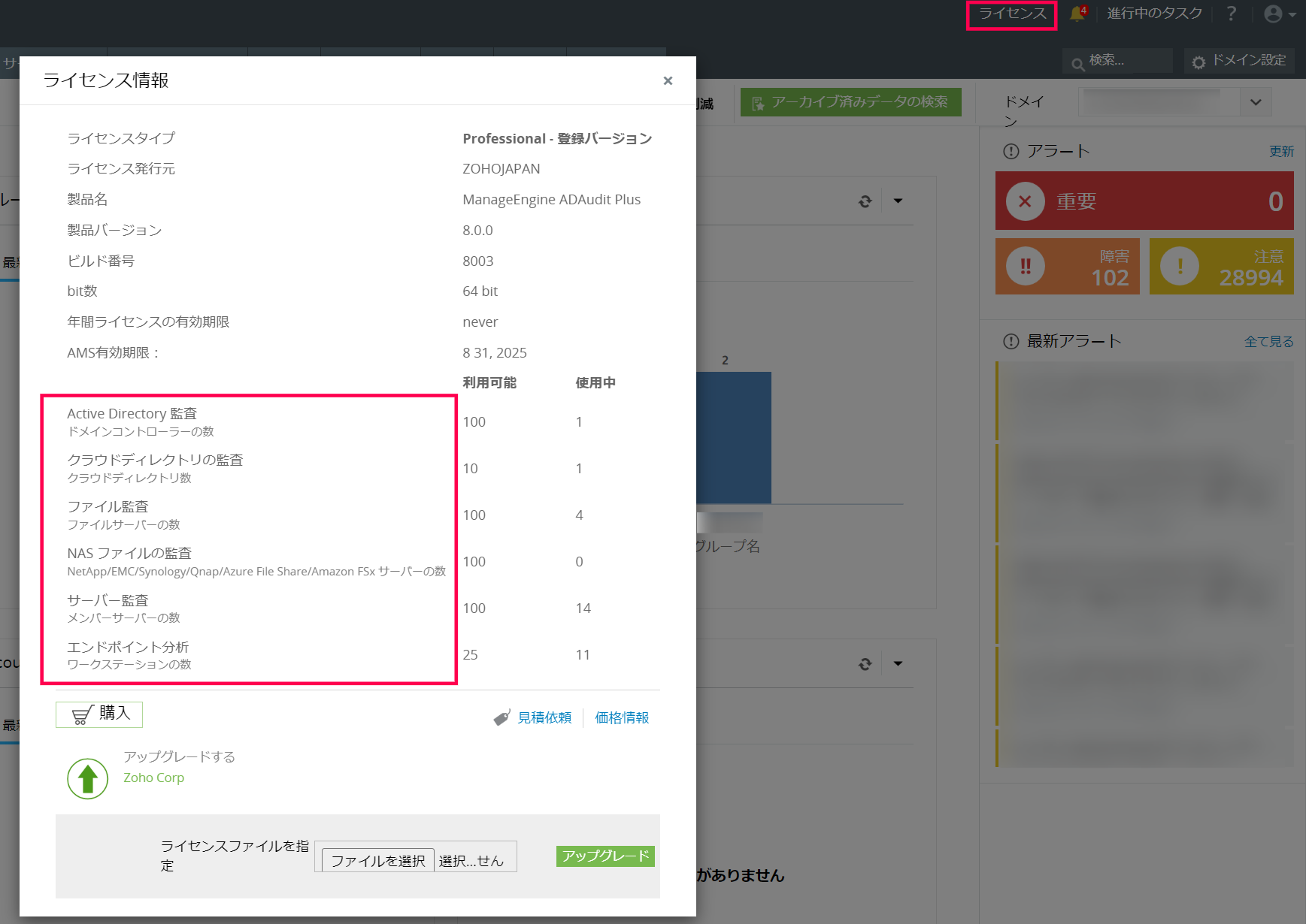 - ビルド8003未満で既に「Azure AD テナント 監査オプションライセンス」を購入済みのお客様は、ビルド8003以降へのアップグレード後にライセンスの付与はありません。