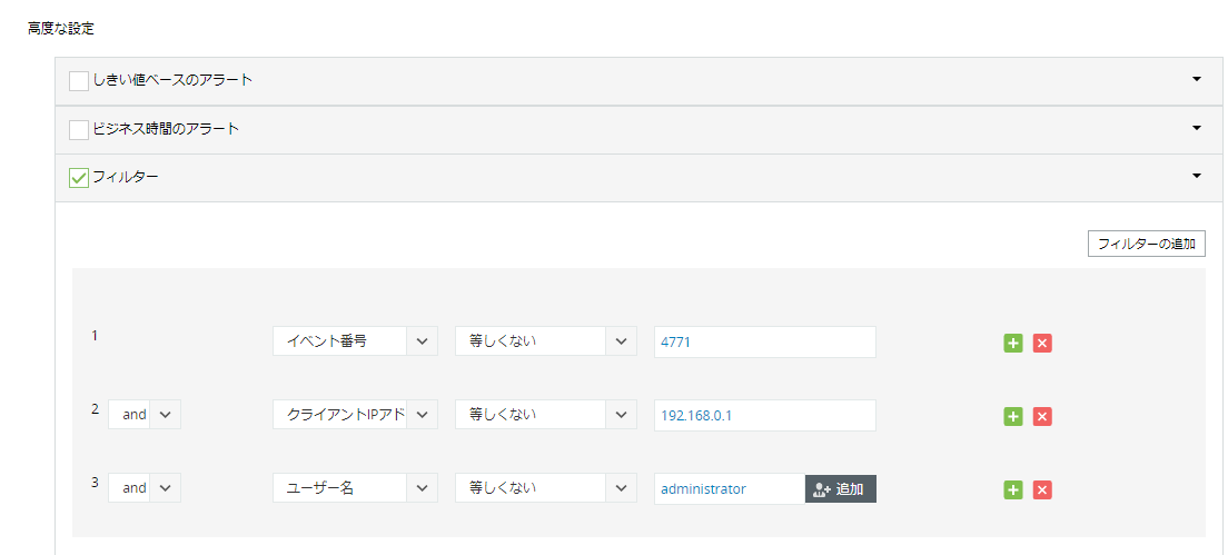 - フィルター・・各レポートプロファイルに対応するフィルター(例:クライアントIPアドレス・イベントタイプ等)と、それに対する条件(例:等しい・含む)を指定し、一致した場合にアラートを発生させます。
