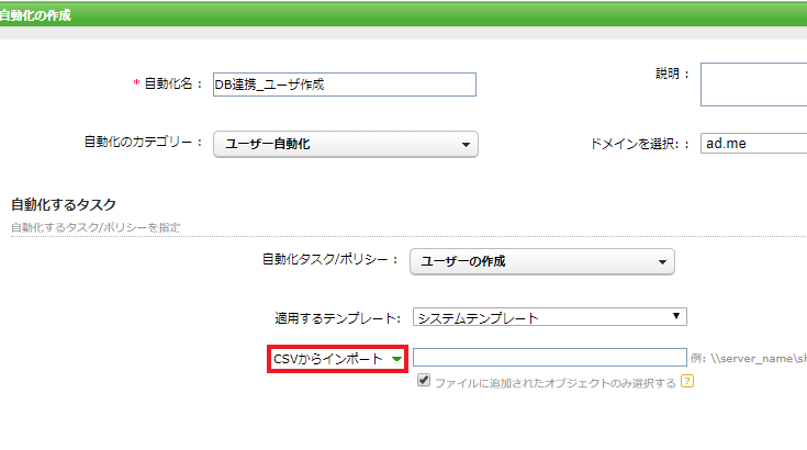 - 自動化名などを入力後、「タスク/ポリシーを選択」よりユーザの作成を選択