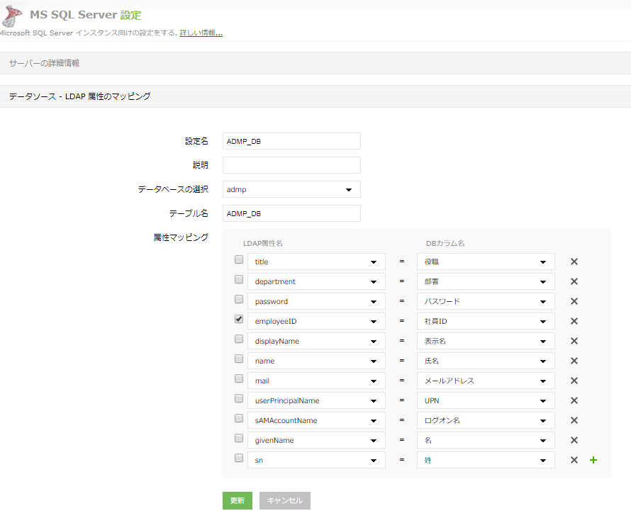 - データベースの選択とテーブル名を入力後、データベースのカラム名とLDAP属性名をマッピング