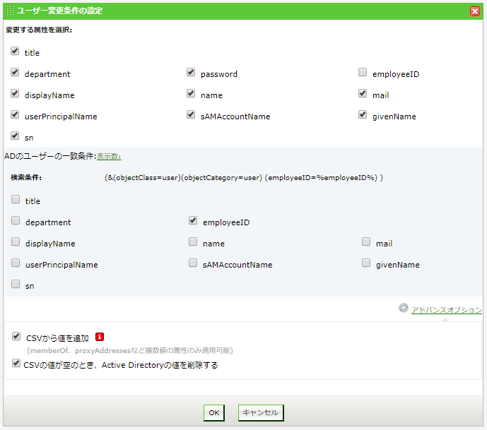 - 「更新する属性」より変更対象の属性やクエリ条件等を設定