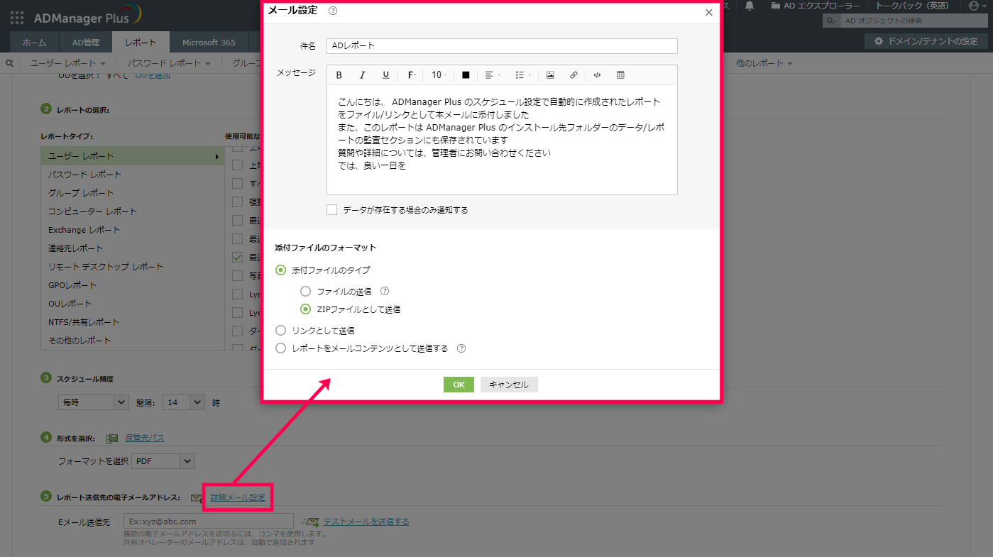 ・レポート送信先の電子メールアドレス:自動生成されたスケジュールレポートの送付先を指定
