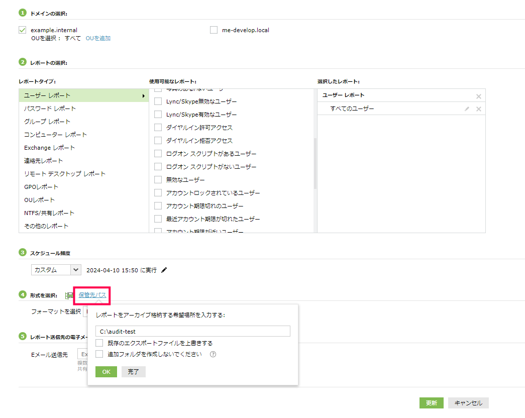 手順内画像のようにパスを入力(C:\audit-test)した場合、「C:\audit-test\reports\<スケジュールレポート作成日>\<スケジュール名>+<スケジュールレポート作成日時>」フォルダー下にレポートが保存されます。