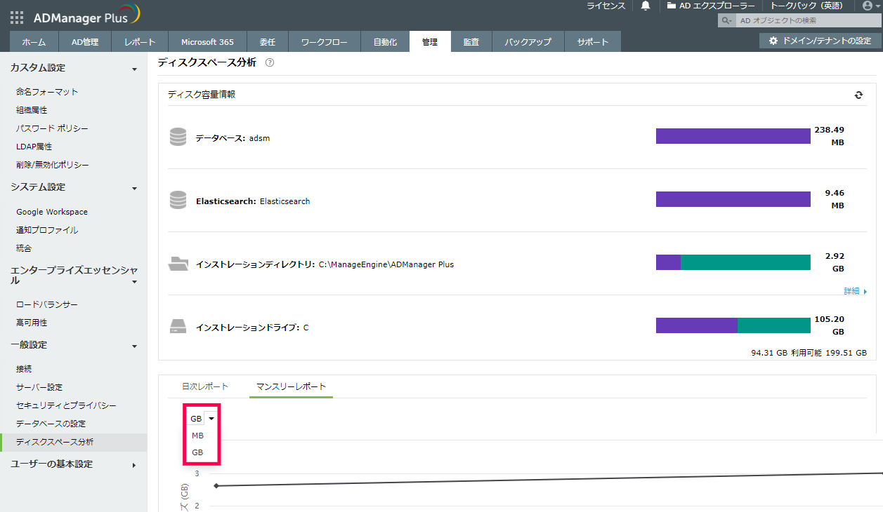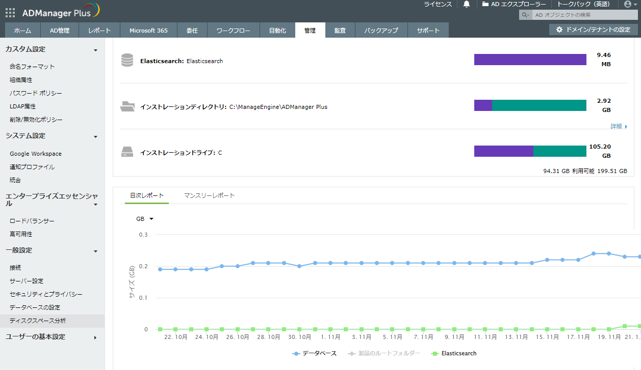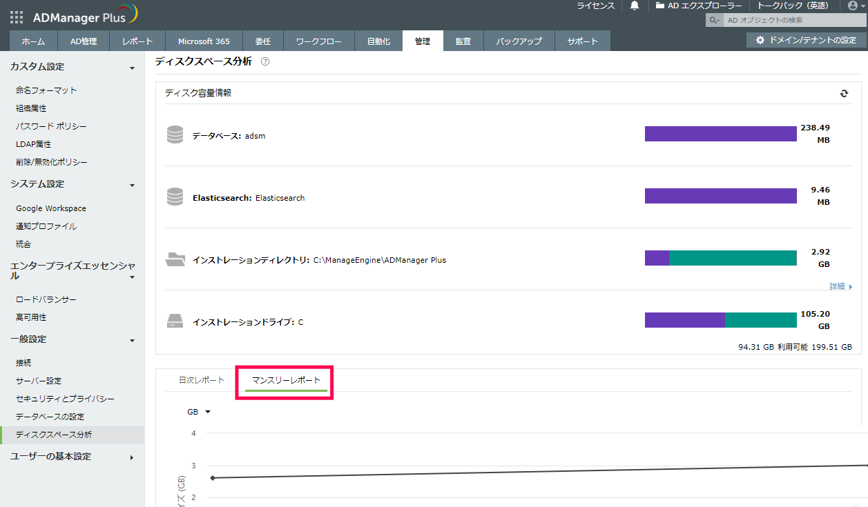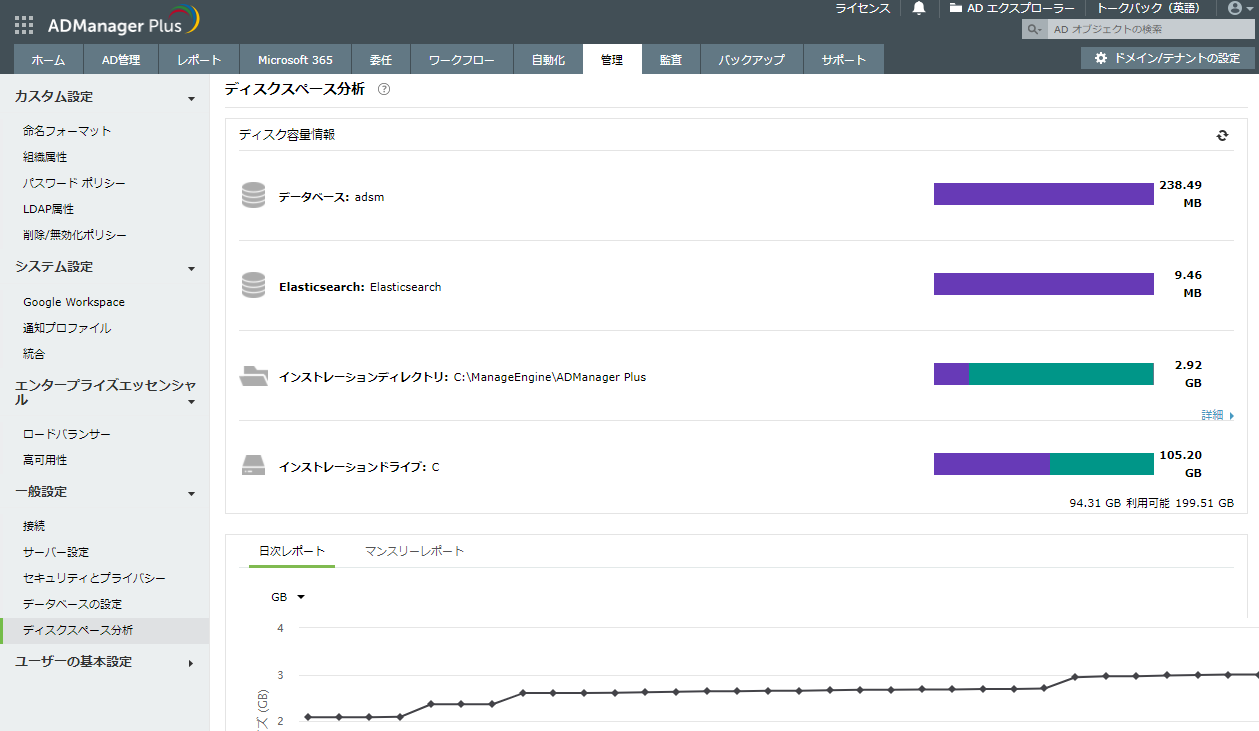 ADManager Plusが使用しているディスク容量を、ADManager Plusの画面上([管理]タブ-->[一般設定]-->[ディスクスペース分析]ページ)でご確認いただけます。