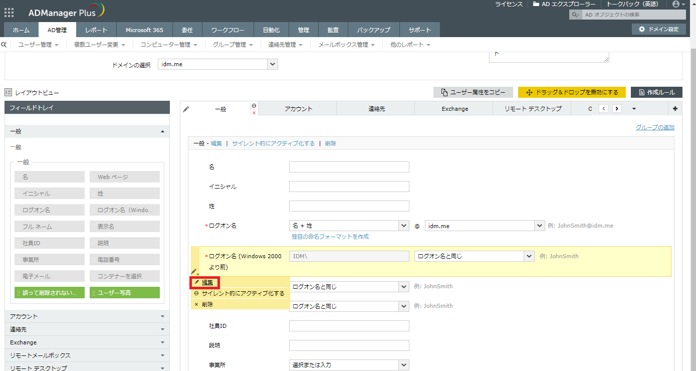 - ログオン名(Windows 2000より前)にポインタを合わせ、編集アイコン(鉛筆マーク)をクリックします。