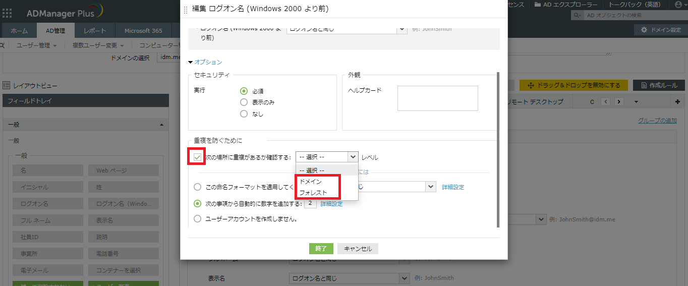 - [重複を防ぐために]にチェックを入れ、重複を確認するレベルをドロップダウン(ドメイン/フォレスト)から選択します。