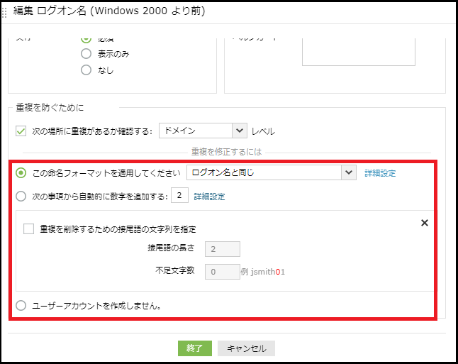 ・次の事項から自動的に数字を追加する: 重複する属性値に数字を追加してユーザーが作成されます。