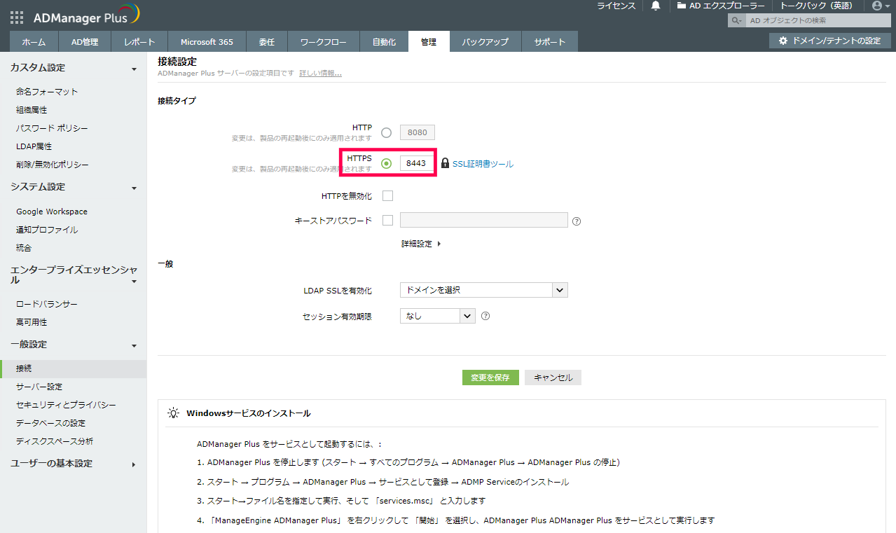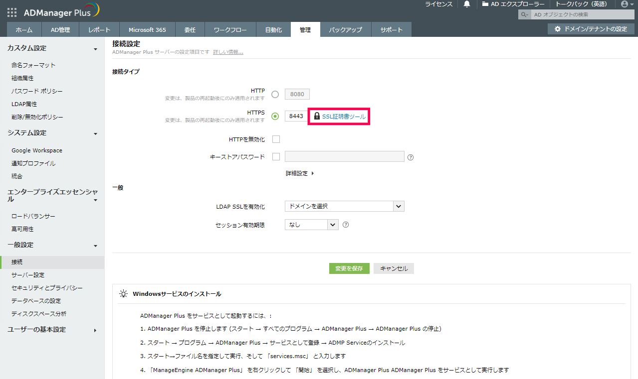 本ナレッジは、本社ページ「Guide to install the SSL certificate in ADManager Plus」を参照しております。